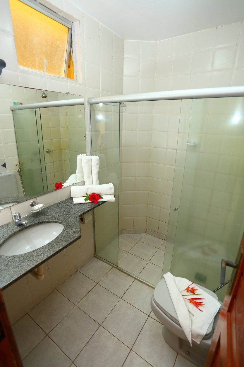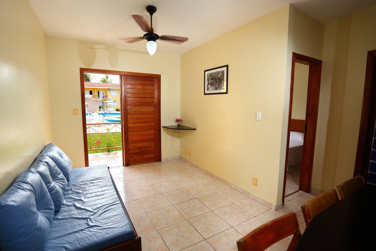 Apartamento para 05 pessoas. A configuração tem 01 cama de casal e 01 cama de solteiro ou 03 camas de solteiro no quarto e as 4ª e 5ª pessoas são acomodadas na sala em sofá-cama.